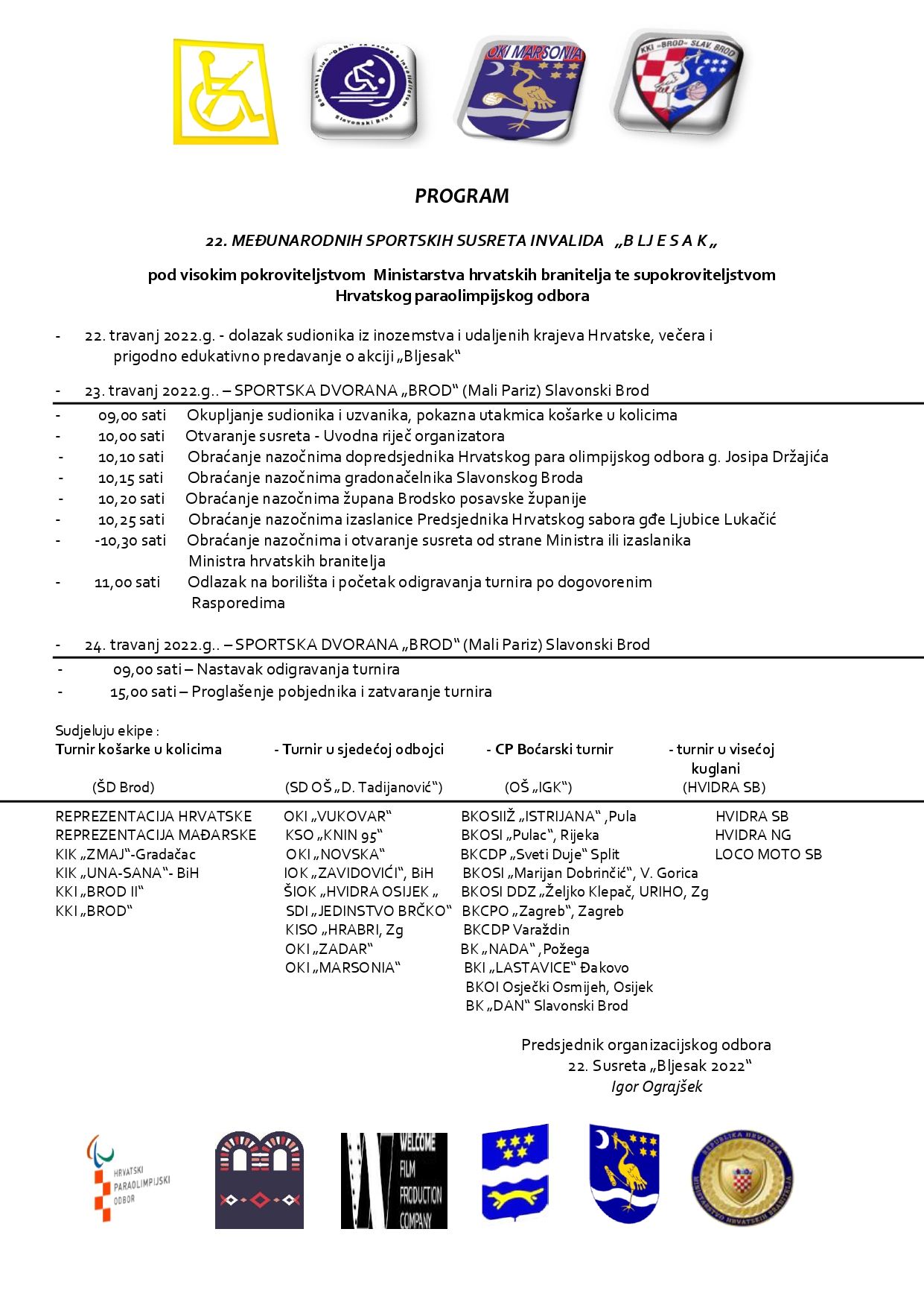 Od petka 22.4.2022. do nedjelje 24.4.2022. u Slavonskom Brodu održavaju se 22. Međunarodne sportske igre "Bljesak".